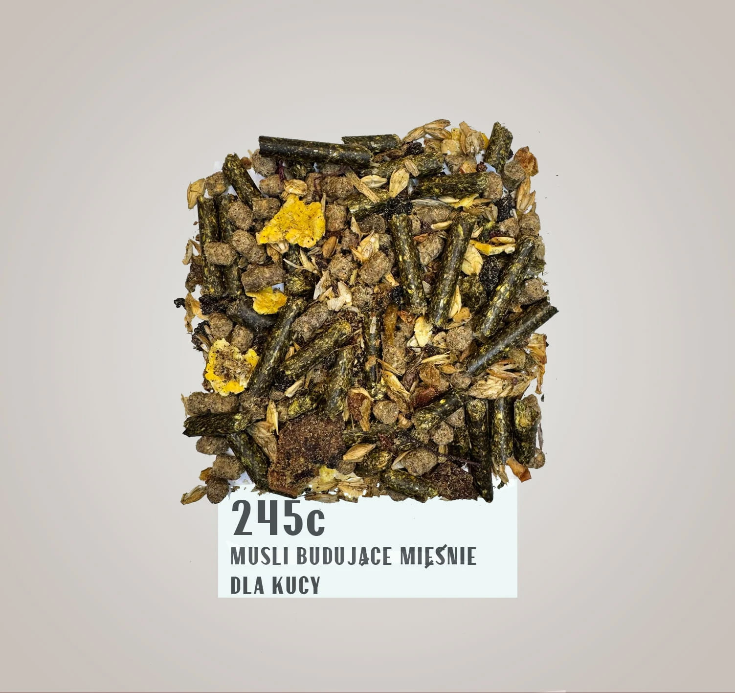 Średnio energetyczna pasza musli dla kucy i koni w lekkim i średnim treningu, potrzebujących wsparcia w zbudowaniu optymalnej masy mięśniowej i nie tolerujących wysokiego udziału ziarna zbóż w diecie. Nie wywołująca efektu nadpobudliwości – głównym źródłem energii są tłuszcze oraz węglowodany strukturalne, które pochodzą z wysoko strawnych komponentów, m.in. z bogatego w niezbędne nienasycone kwasy tłuszczowe Omega-3/-6 oleju lnianego. Niewysoki udział mikronizowanego ziarna jęczmienia i kukurydzy, które stanowią drugie źródło energii w paszy – szybko uwalnianej, która będąc w tak niedużej dawce zostanie szybko zużyta przez organizm do pracy treningowej. Pasza zawiera wysokiej jakości białko pochodzące z różnorodnych komponentów (lucerna, otręby ryżowe, makuch lniany, śruta sojowa i słonecznikowa) oraz dodatkowy kompleks egzogennych aminokwasów niezbędnych do prawidłowej syntezy białka, które jest kluczowe dla kształtowania kondycji mięśniowej, budowy tkanek i komórek organizmu. Dodatkowy udział wysoko strawnego błonnika, prebiotyków, wapiennych alg morskich i liścia pokrzywy bogatego w cenne substancje bioaktywne dba o zdrowy układ pokarmowy i zabezpiecza organizm przed deficytem składników odżywczych. Optymalnie zbilansowana dawka składników mineralnych i witamin, zwłaszcza tych uczestniczących w prawidłowej pracy włókien mięśniowych, zapewnia szybką regenerację powysiłkową i sprawnie funkcjonujący aparat mięśniowy.