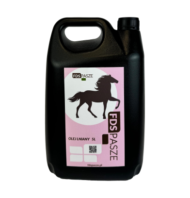 FDS Olej Lniany 5L to cenny składnik wspierający zdrowie, kondycję i witalność koni.